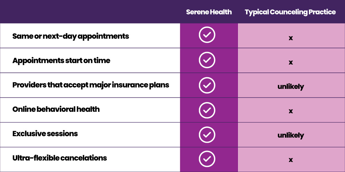 One of the biggest reasons why patients like yourself go without care is due to the inability to see their providers. Mental health affects the way we think, feel and act. It also helps determine how we handle stress, relate to others, and make choices. Mental health is important at every stage of life, from childhood and adolescences through adulthood. Serene Health is solving this issue by putting your mental health first and focusing on treating the whole person, with ample appointment availability through our Telehealth platform.
